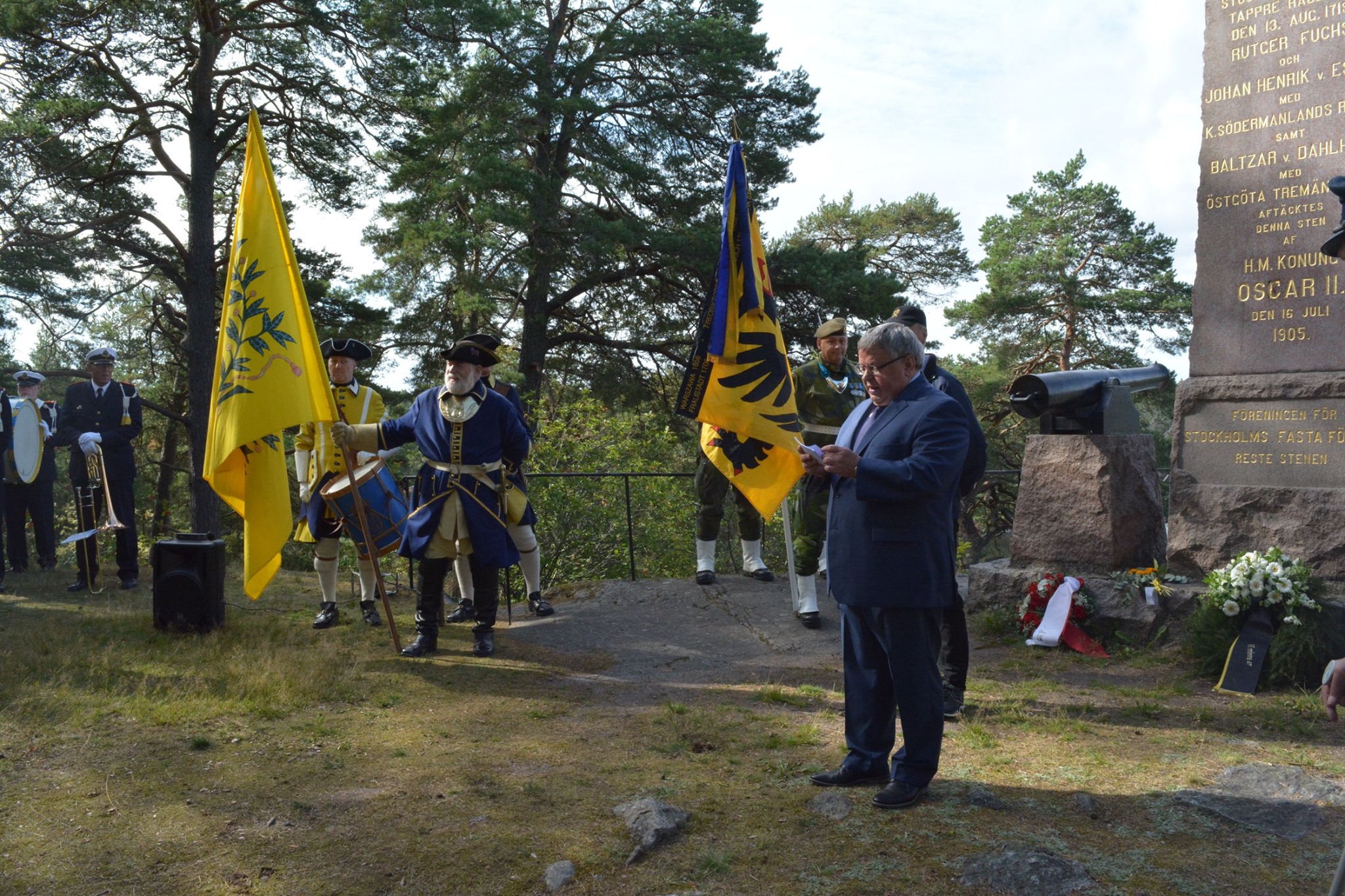 Idag har vi samlats här, framför det här minnesmärket vid Baggenfjärden för att hedra minnet av de svenska och ryska krigare vilka stupade vid slagfältet för tre hundra år sedan.