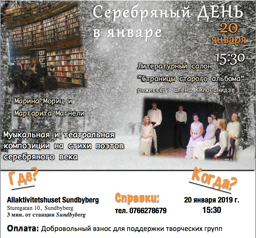 Мы предлагаем вам зарезервировать воскресение 20-е января для нового пoсещения завораживающего мира поэзии Серебряного века! Этот музыкально-поэтический вечер готовят для вас наши самоотверженные служители русской культуре, искусству, музыке и поэзии. Наши любимые Марина Мориц и Рита Магнели с уводящими вдаль песнями на серебряную поэзию! Удивившие и даже потрясшие всех своим первым выступлением в Стокгольме ребята из театрального салона “Страницы старого альбома” с трогательным и изящным литературным спектаклем по поэзии Серебряного века.