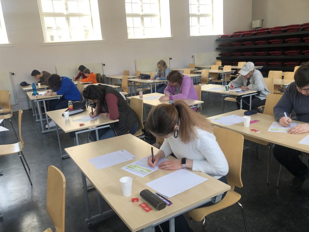 Пока смотрели видео, подтянулись и опаздывающие. Наконец, все получили и заполнили бланки. Диктант начался. Интересно, что среди пишущих были и новички, которые лишь за пару дней до этого услышали о Тотальном диктанте, например, оперная певица Катя, приехавшая из Харькова. Были и те, кто не пропустил ни разу возможности проверить свое знание русского языка. А Антонина писала второй раз, и ее результат пока лучший: две пунктуационные ошибки. Хороший результат и у Эвелины, она ошиблась лишь три раза. А в целом почти все написали очень неплохо.