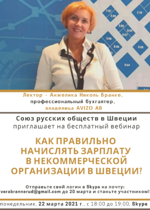 22 марта 2021 года Союз русских обществ в Швеции проводит бесплатный вебинар по ведению бухгалтерии в некоммерческих организациях. Правильная отчетность, оформление, порядок начисления заработной платы и других выплат – эти актуальные темы будут раскрыты в ходе вебинара «Как правильно начислять зарплату в некоммерческой организации в Швеции?». Вебинар будет проходит в Skype. Лектор – опытный […]