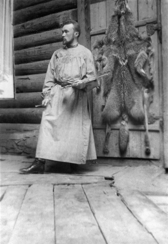Ill. 03. Nikolaj Roerich i sin verkstad i Izvar. Foto. Izvar var Roerichs föräldragods, 100 km från S:t Petersburg, där mästaren tillbringade sin barndom och ungdom. Från 11 års ålder deltog den blivande konstnären tillsammans med arkeologer i utgrävningen av urgamla gravhögar i närheten av godset.