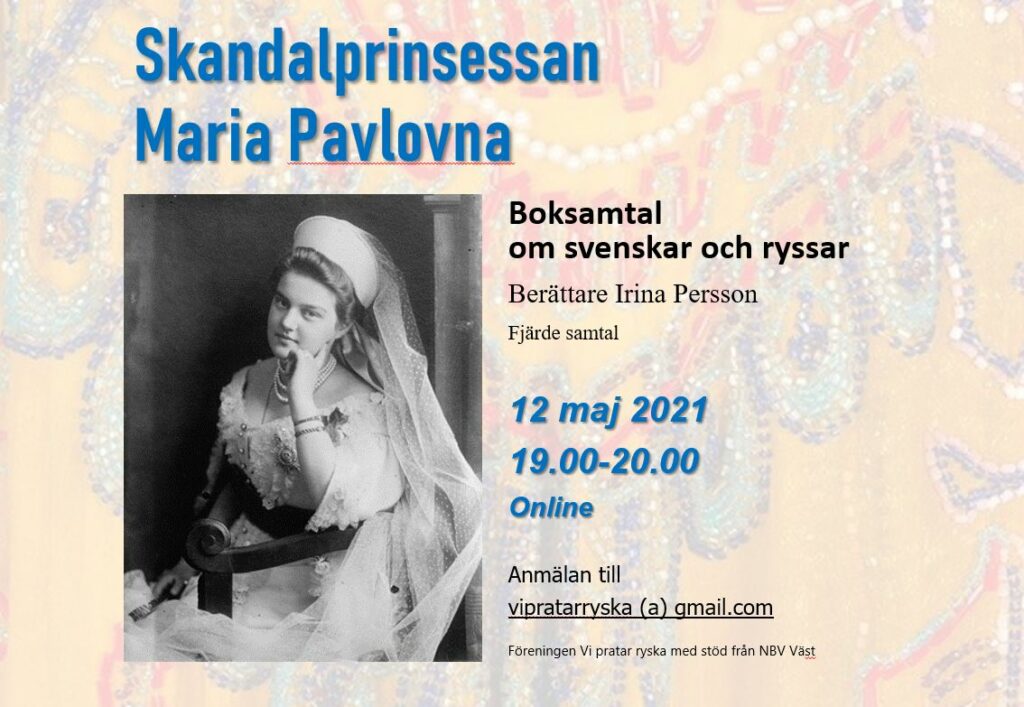 12 maj kl.19 berättar Irina Persson om Maria Pavlovna Romanova och visar böcker om och av henne. Maria Pavlovna var kusin till Nikolaj I. I 1908 gifte hon sig med prins Wilhelm. Kom och lyssna vad hände sedan.