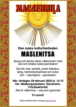 29 февраля 2020 года в центре Стокгольма, на площади Medborgarplatsen на открытом воздухе состоится празднование Масленицы. Гостей праздника ждут веселые игры, вкусные угощения, живые выступления российских, польских, сербских творческих коллективов и традиционная ярмарка изделий ручной работы и продуктов питания. (Российские гости представлены будут двумя детскими группами, одна из них спляшет на площади Medborgarplatsen. Другая – […]