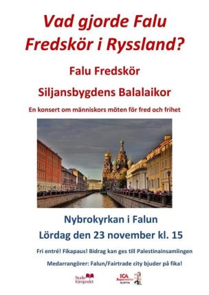 Falu Fredskör åkte till St. Petersburg i oktober 2019. Vi ville verka för fred genom att bygga broar mellan människor. Vi träffade två ryska körer och hade tre konserter. Vi träffade också miljöaktiva människor och talade om miljö och klimat. Temat för våra konserter i Falun och Borlänge är människors möten för fred och frihet. […]